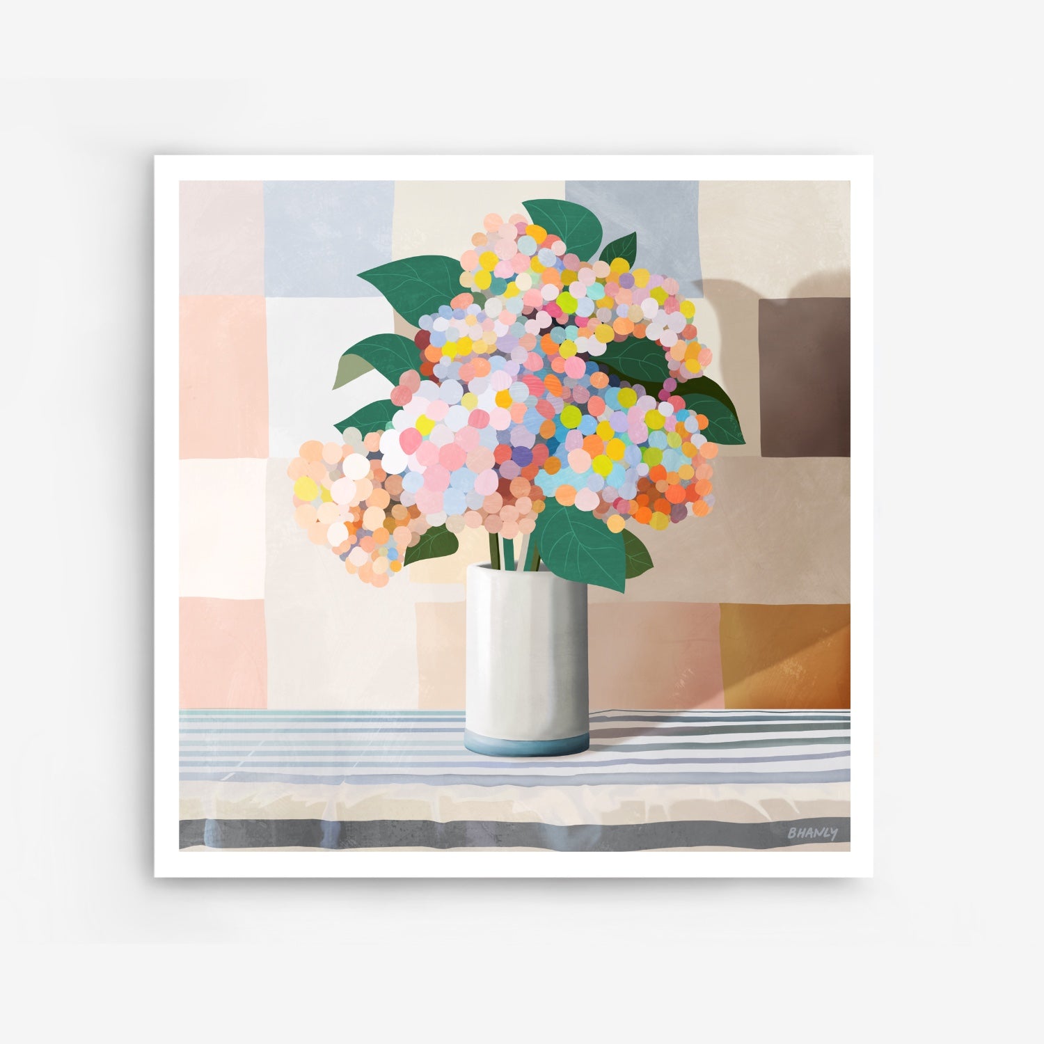 Unveiling our 'Kaleidoscope Blooms' premium art print, where the timeless hydrangea gets a technicolor twist. Each bloom bursts with a spectrum of colours, confidently sitting in a crisp white vase. The backdrop? A subtly abstract checkered pattern, dabbling in muted blues, gentle pinks, and a touch of ochre. It's a dance between traditional beauty and modern contemporary flair. So, whether you're dressing up your living room, bedroom, or that cozy reading nook, this print blends artful design with a splash of nostalgia. Bring home 'Kaleidoscope Blooms' and watch your space transform into an artful haven.