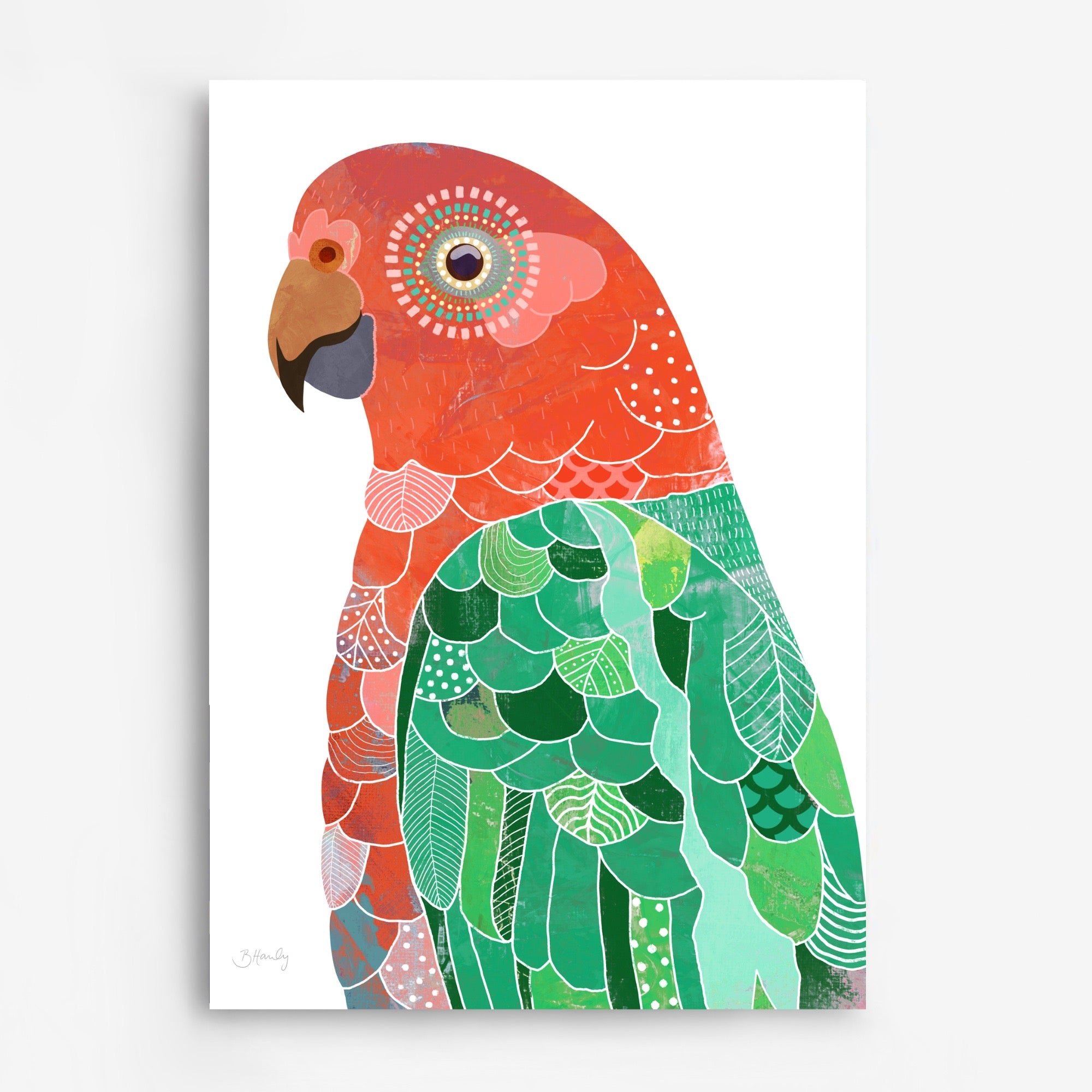 With its striking hues and mesmerising patterns, this piece is sure to command attention and add a touch of colour to any space. Each feather intricately weaves together vibrant tones and captivating patterns, capturing the essence of the King Parrot's charisma and playfulness.
