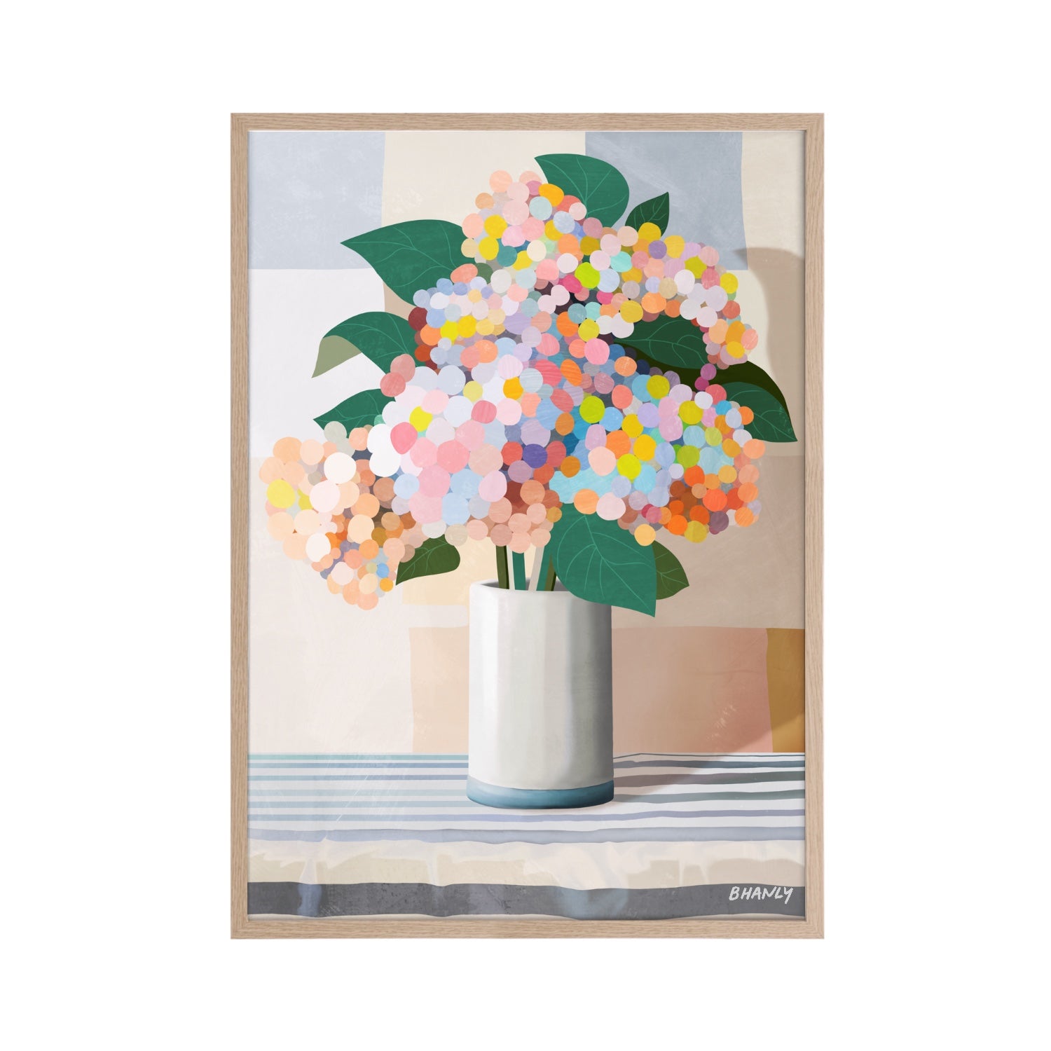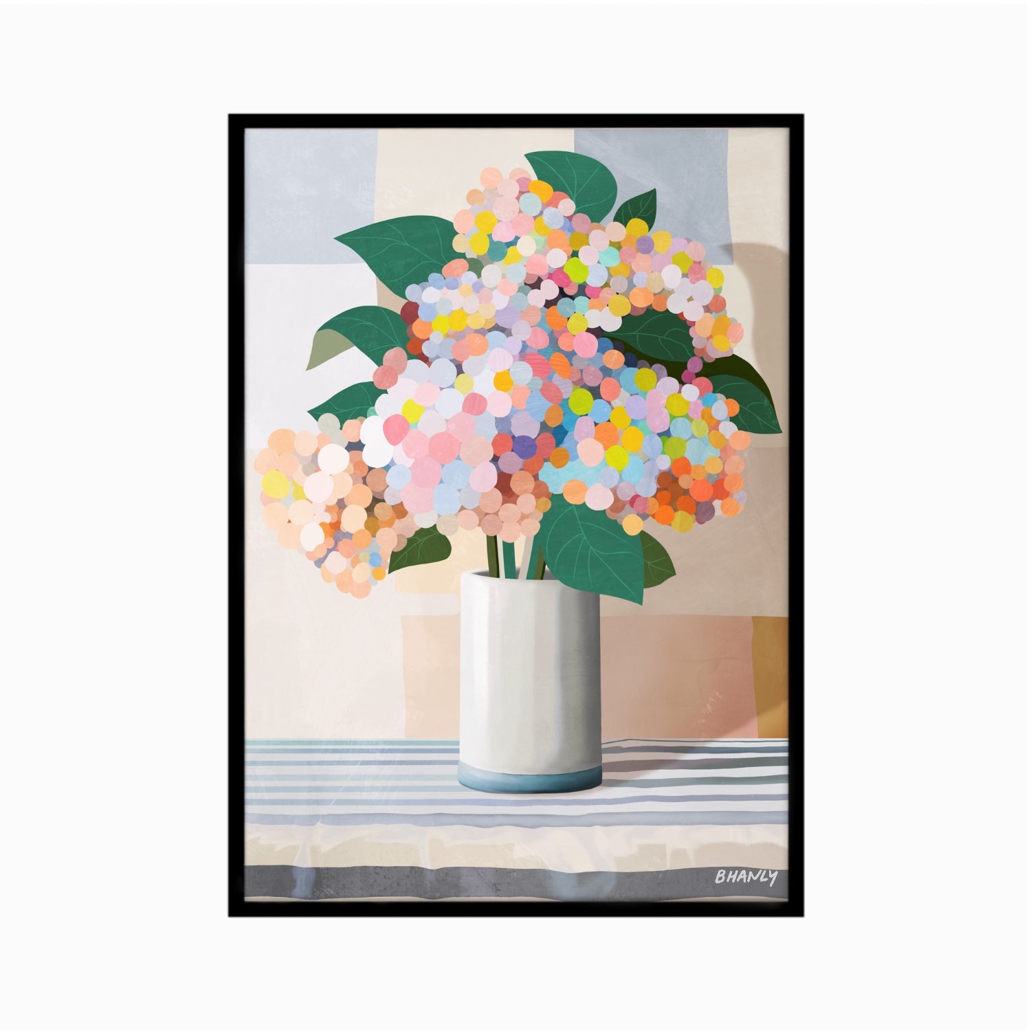 Unveiling our 'Kaleidoscope Blooms' premium art print, where the timeless hydrangea gets a technicolor twist. Each bloom bursts with a spectrum of colours, confidently sitting in a crisp white vase. The backdrop? A subtly abstract checkered pattern, dabbling in muted blues, gentle pinks, and a touch of ochre. It's a dance between traditional beauty and modern contemporary flair. So, whether you're dressing up your living room, bedroom, or that cozy reading nook, this print blends artful design with a splash of nostalgia. Bring home 'Kaleidoscope Blooms' and watch your space transform into an artful haven.