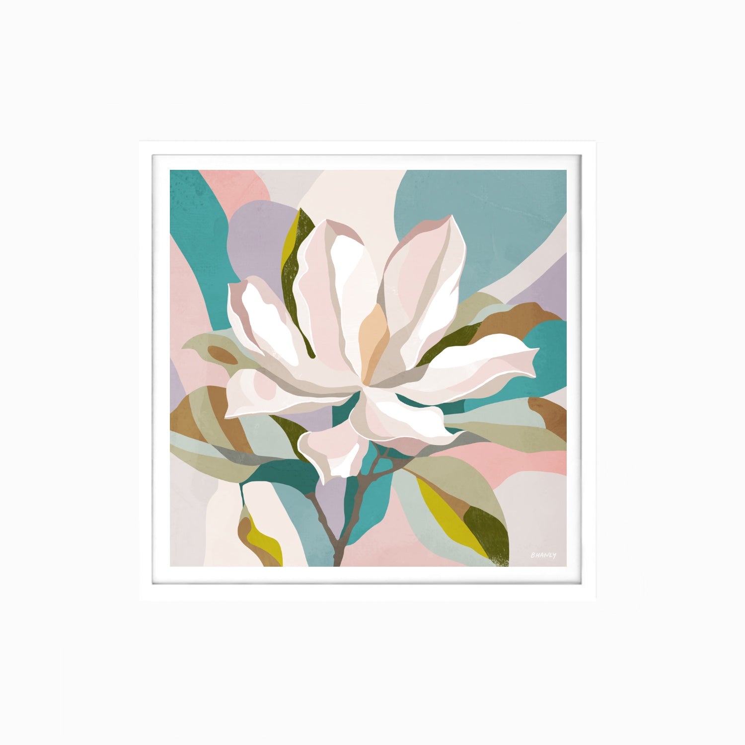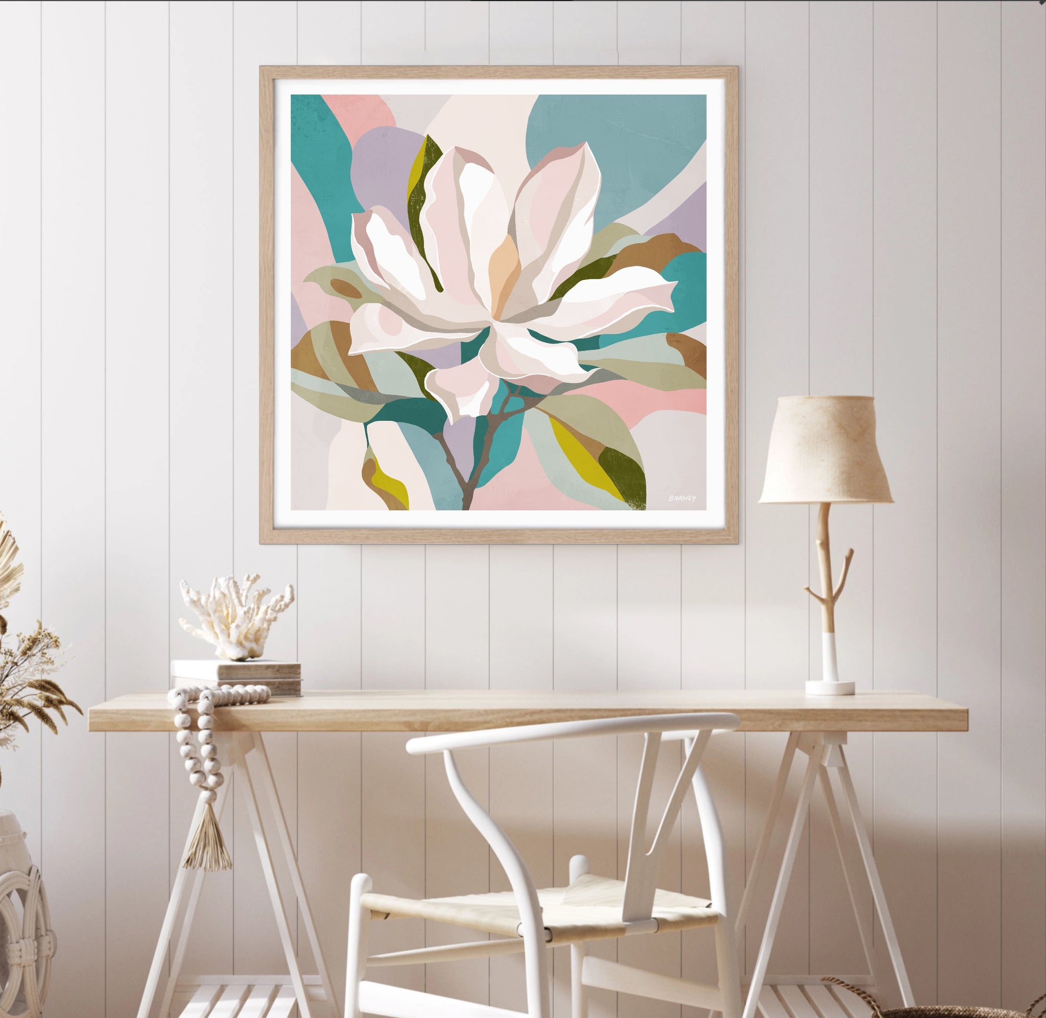 Ready for a decor upgrade? Bring the timeless beauty of magnolia blooms into your space with our stunning art print. Capturing the delicate elegance of magnolia flowers against a backdrop of abstract pinks and turquoise, this piece is sure to be a statement piece in any room.