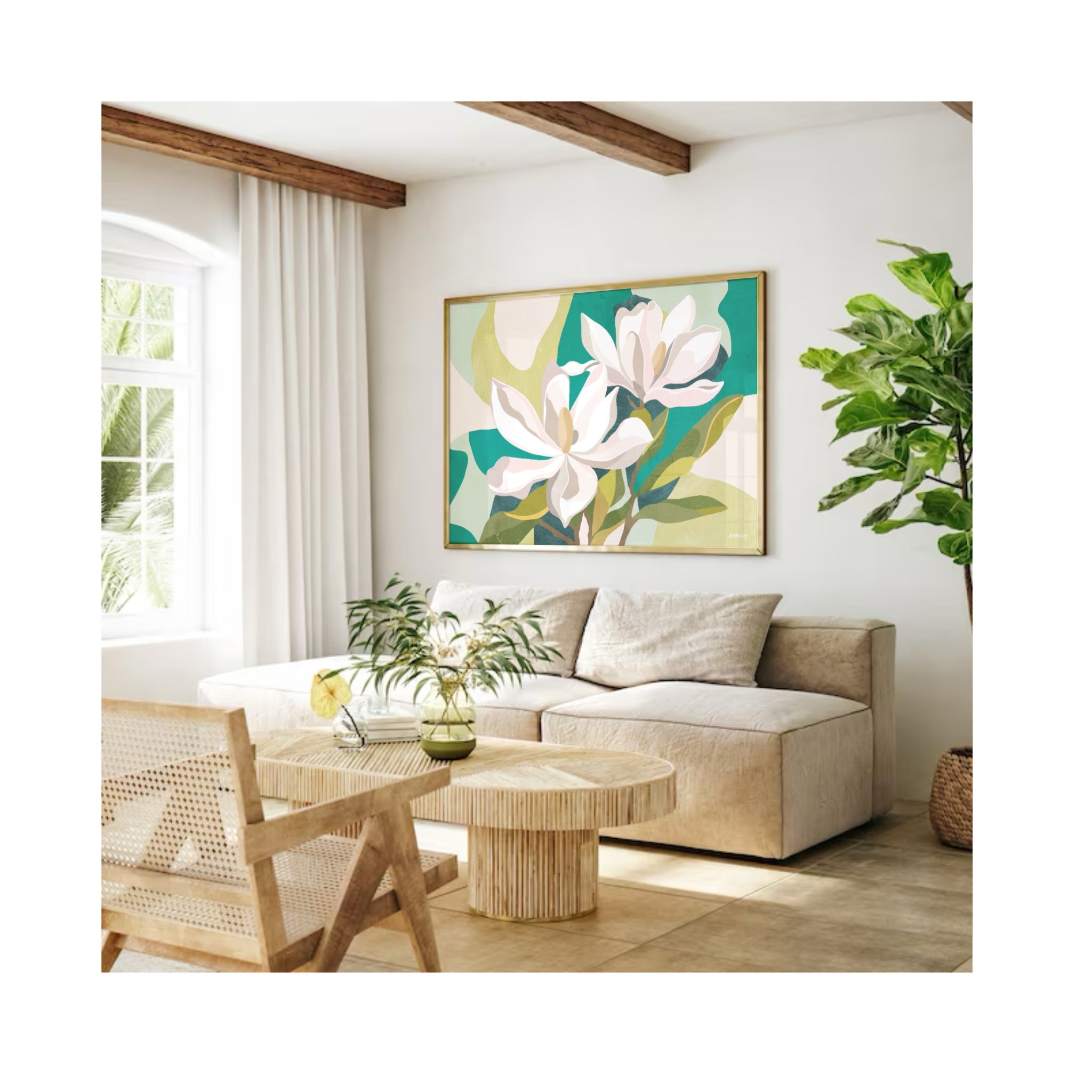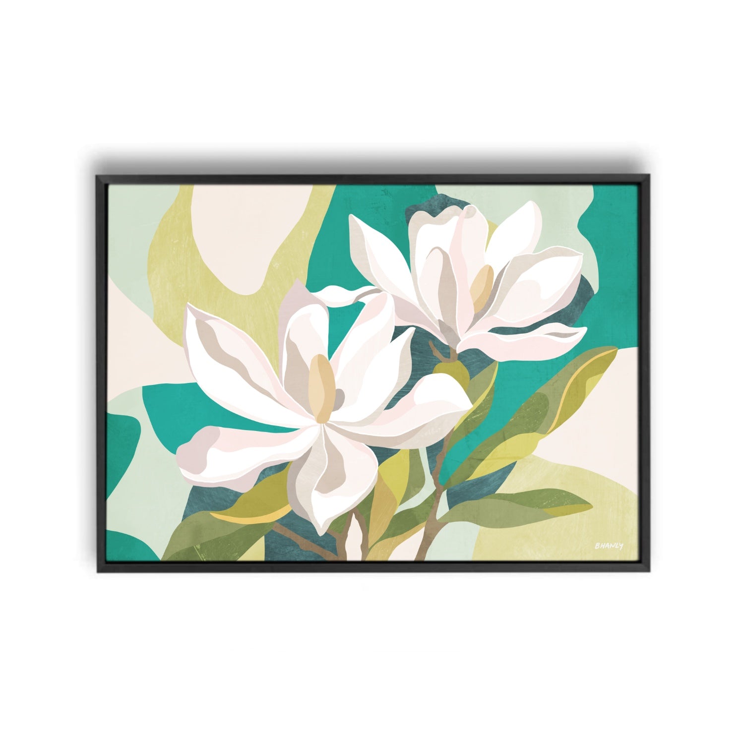 Bring the timeless beauty of magnolias into your space with this stunning art print. Featuring the charm of magnolia flowers amongst a background of abstract shapes of alluring greens, this piece is sure to make a statement on any wall.