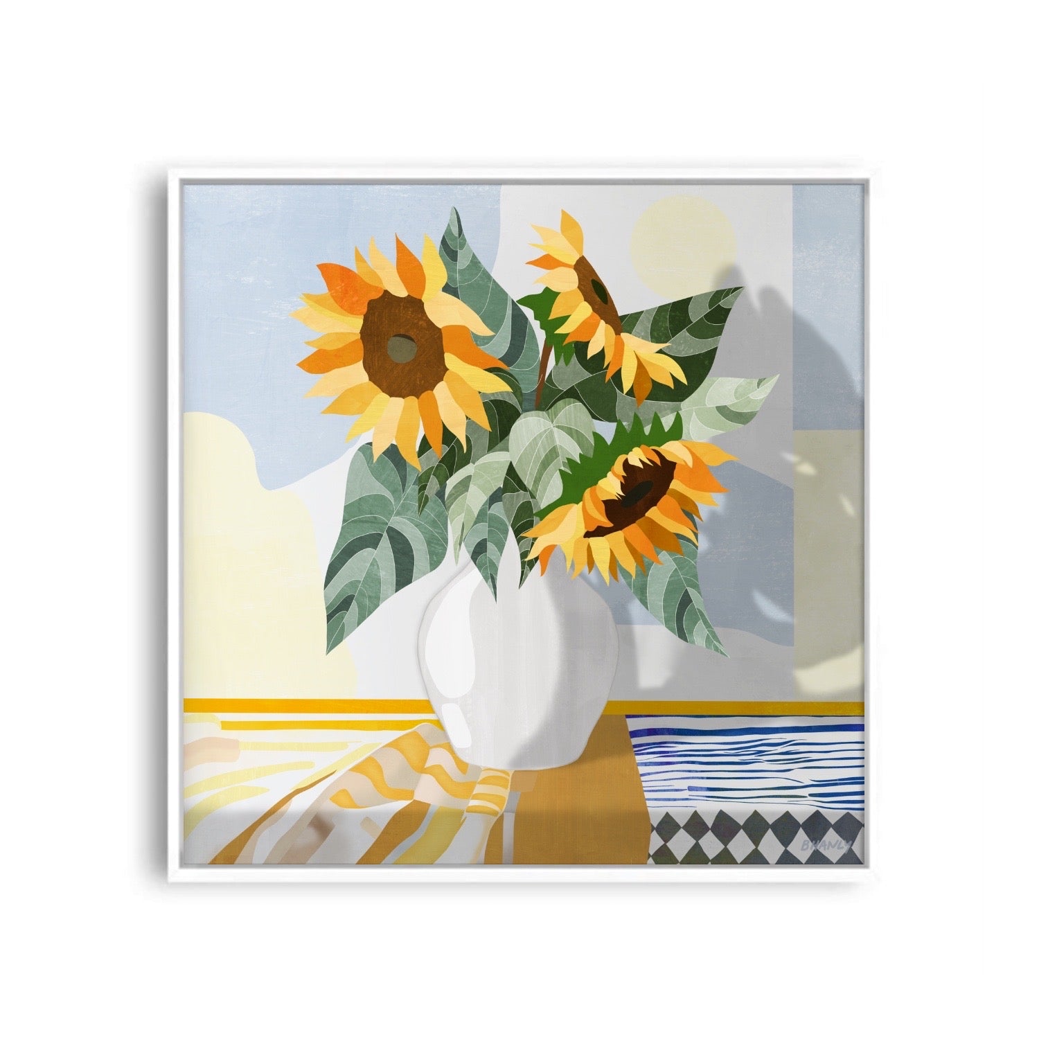 Introducing 'Sunflower Serenade,' where contemporary chic meets natural beauty. This premium canvas print is no wallflower— it takes center stage with its radiant sunflowers, confidently displayed in a sleek white vase. The backdrop? A tastefully abstract mix of cool blues and muted yellows, all resting on an ochre and blue striped tablecloth. Think of it as modern art with a dash of flair, offering both vibrancy and sophistication. It's perfect for those spaces craving a touch of elegance with an artful twist. So, if you're looking to elevate your décor with a blend of warmth and modernity, 'Sunflower Serenade' might just be your next conversation piece.