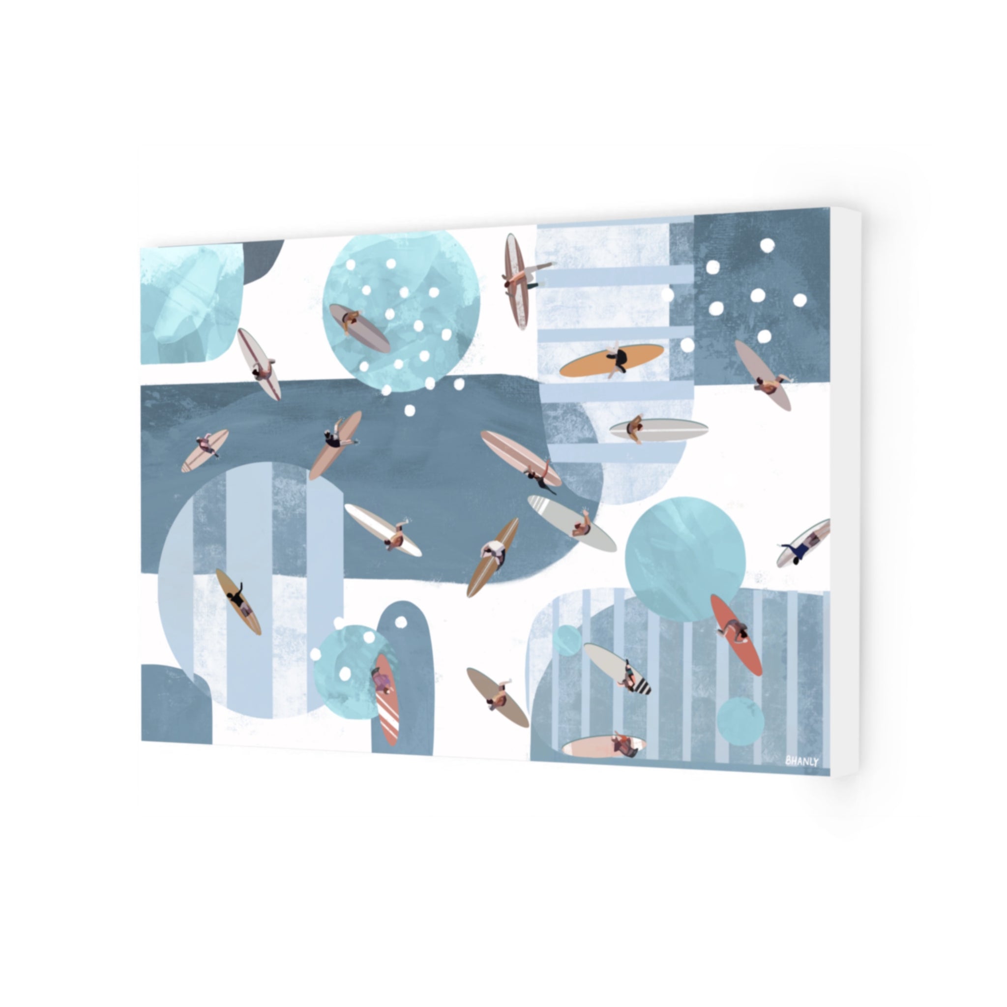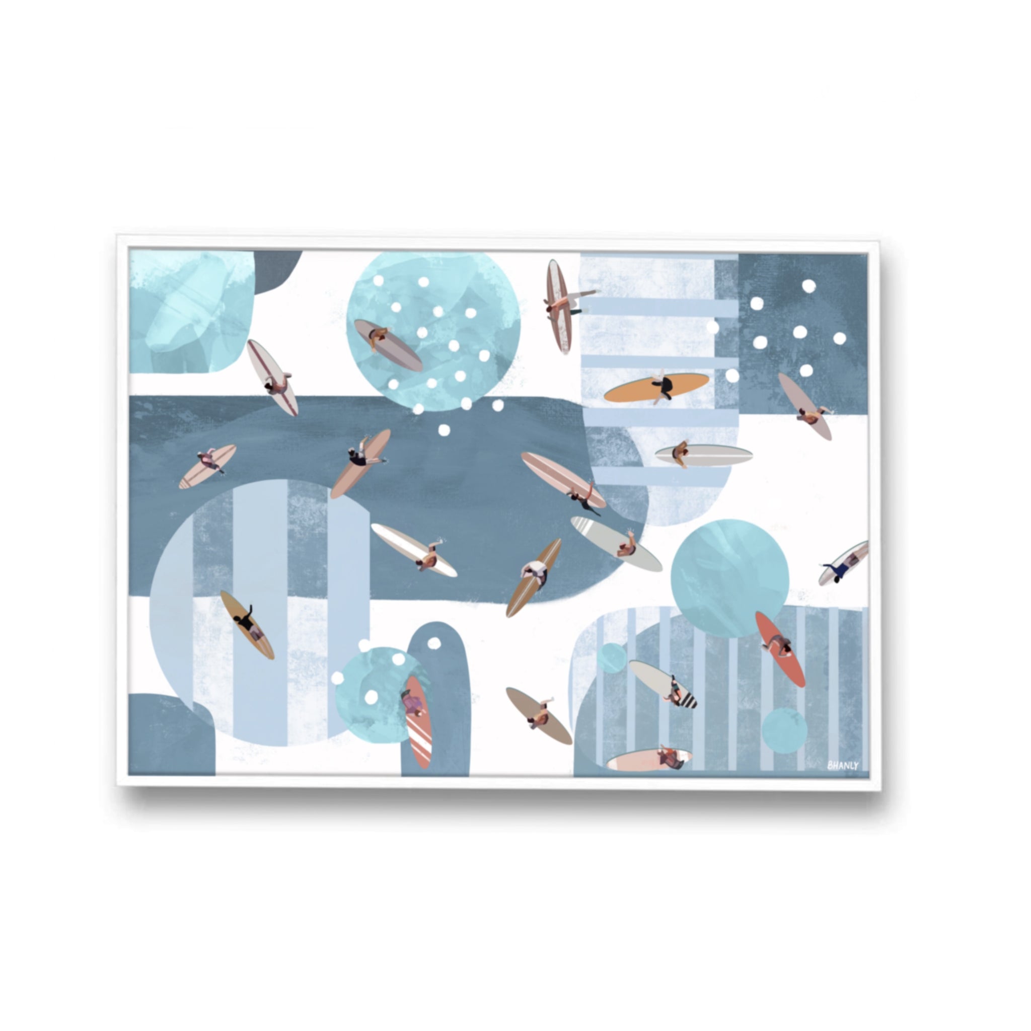 Add some modern coastal vibes to your space with this beautifully hand drawn landscape surfing print. Complete with calming blues and pops of pattern this print with be the perfect fit for a beach house or coastal home.