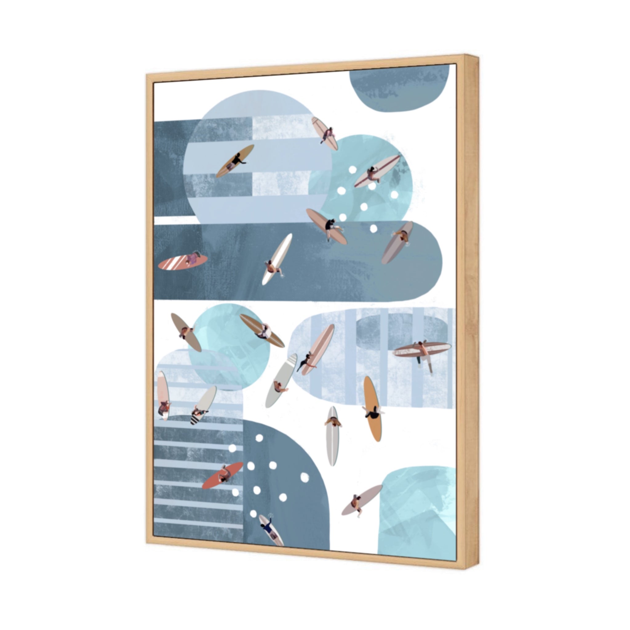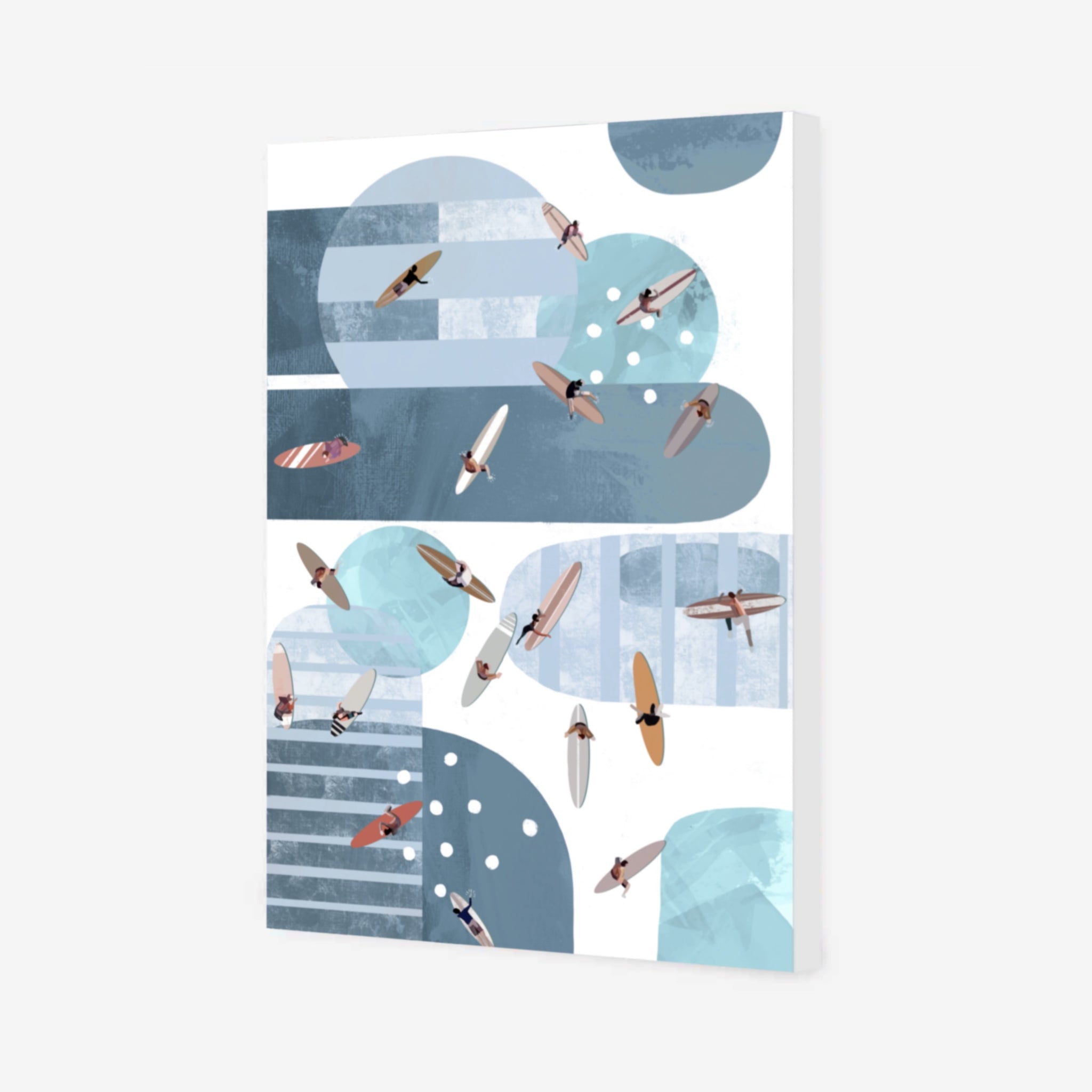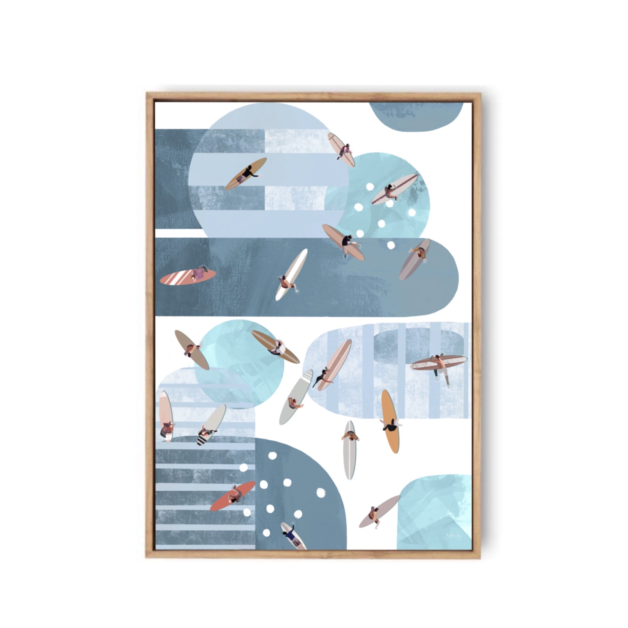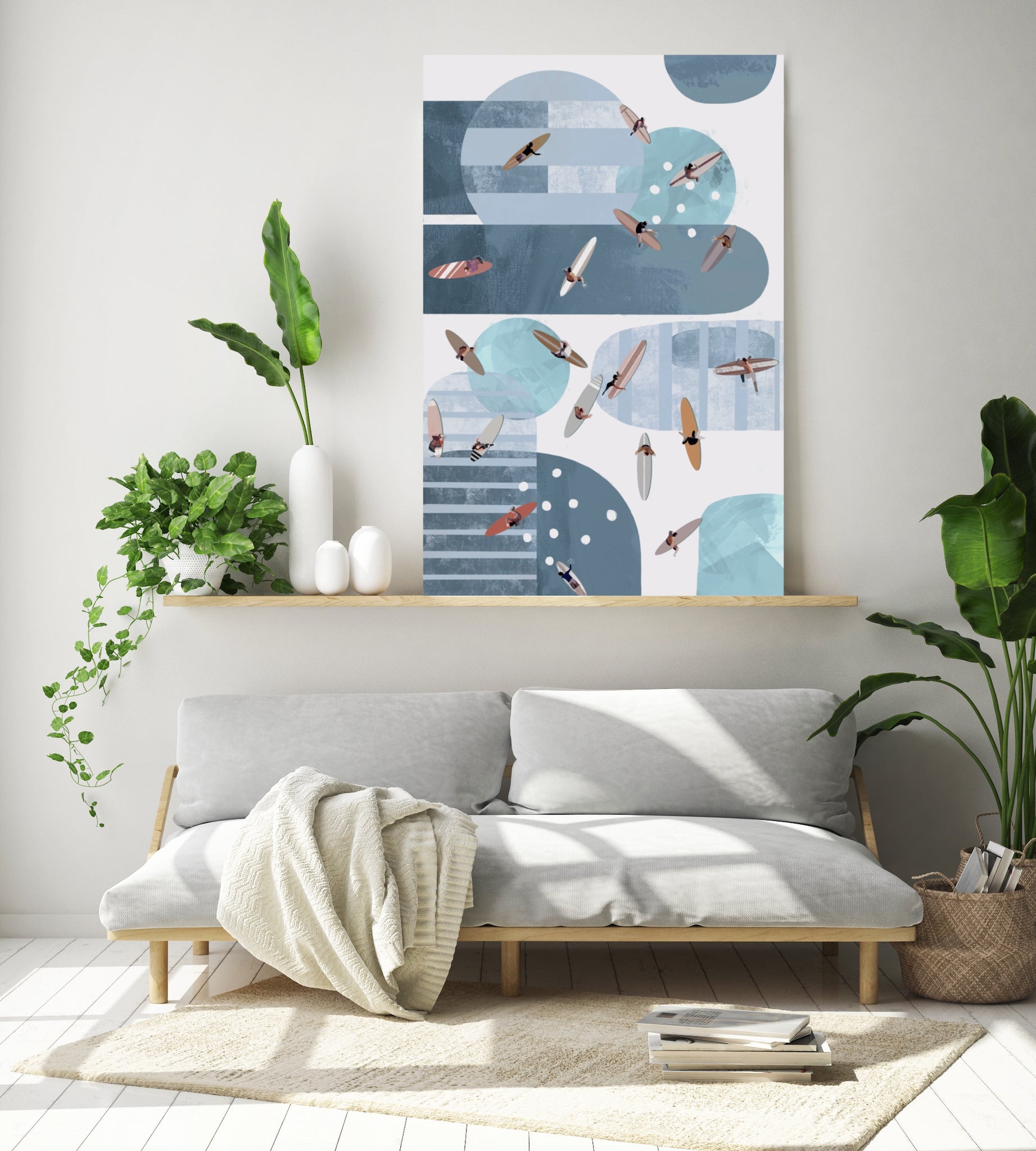 Add some modern coastal vibes to your space with this beautifully hand drawn surfing print. Complete with calming blues and pops of pattern this print with be the perfect fit for a beach house or coastal home.