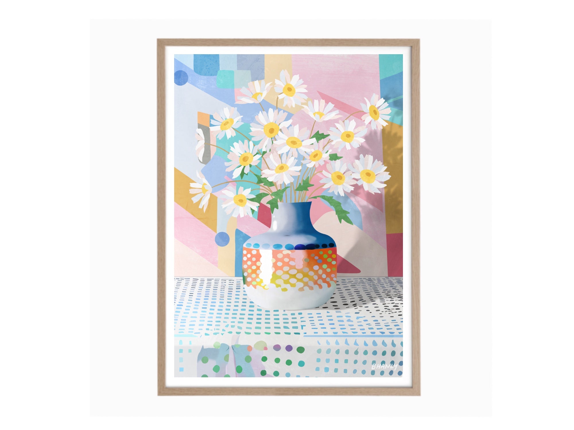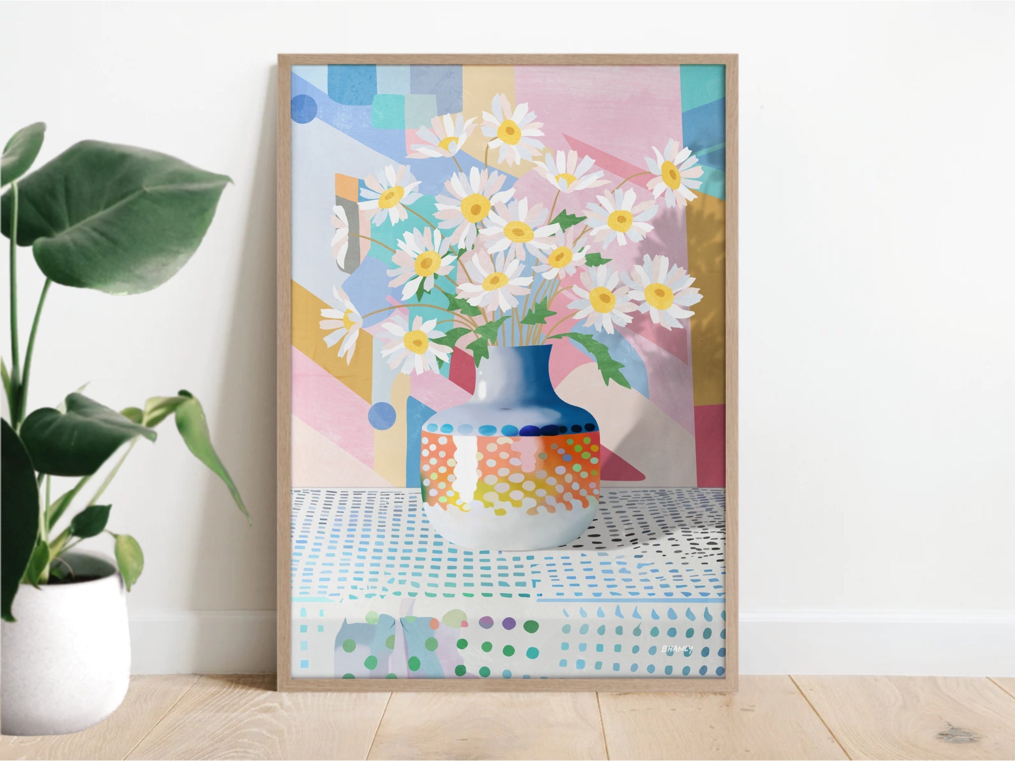 Step into a world where colour meets charm in our 'Delightful Daisy' premium art print. It flaunts a lively array of white daisies, taking centre stage in a colourful polka dot vase. Below, a blue polka dot tablecloth sets the scene, while a backdrop teaming with multicoloured stripes and artsy shapes celebrates modern art influences. This print dances through shades of mustard, pink, blue, and teal, striking the right chord for home decor enthusiasts and interior decorator alike. Whether it's the living room, bedroom, or that corner in your office needing a little flair, this piece brings both vibrancy and a dash of yesteryears. Dive into colour and let 'Delightful Daisy' work its magic in your space.